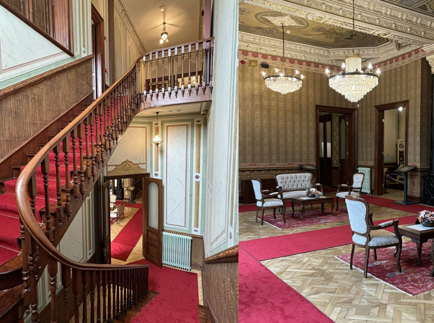 Trabzon Müzesi‘ni özel kılan unsurlardan biri de konağın kendisinin bir sanat eseri olmasıdır. Yapının zemin katı ve üst katlardaki odaları, 19. yüzyıl sonu sivil mimarisinin en parlak örneklerini sunar. İtalyan mimarlar tarafından tasarlanan konak, Barok ve Rokoko tarzı tavan süslemeleri, ahşap işçiliğinin incelikleri ve duvarlardaki kalem işi bezemeleriyle göz kamaştırır.